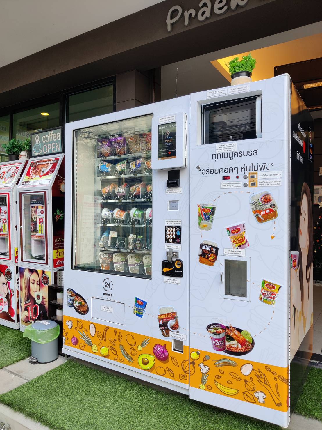 ไมโครเวฟอัตโนมัติ ตั้งเวลา1นาที ปรับความร้อนได้ตามความต้องการ ขายอาหารกึ่งสำเร็จรูปและกาแฟต่างๆ ระบบตัดไฟเองเมื่อใช้งานเสร็จ