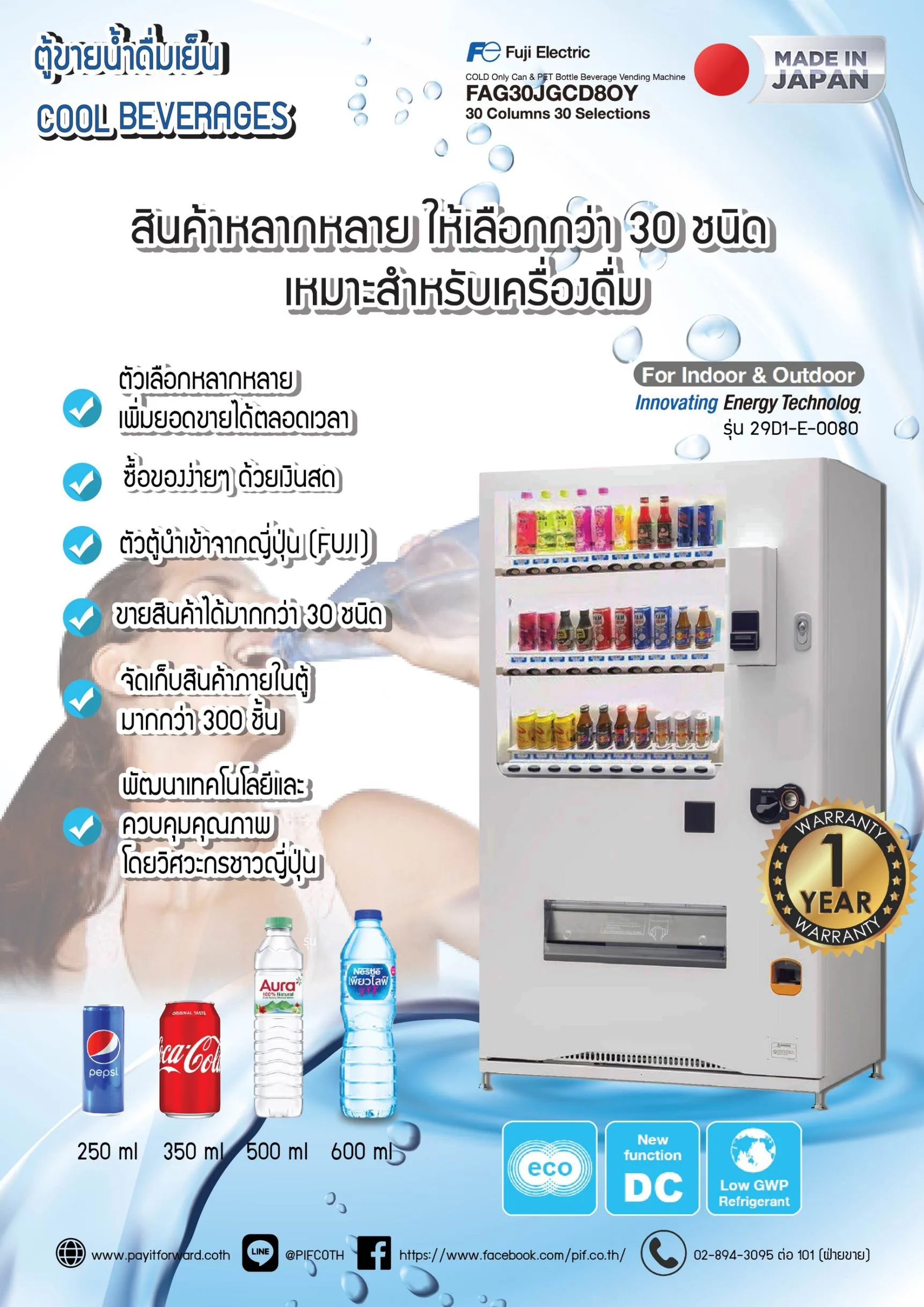 - จำหน่ายสินค้า 30 ชนิด บรรจุน้ำมากกว่า 400 ขวด (ขึ้นอยู่กับขนาดสินค้า)
