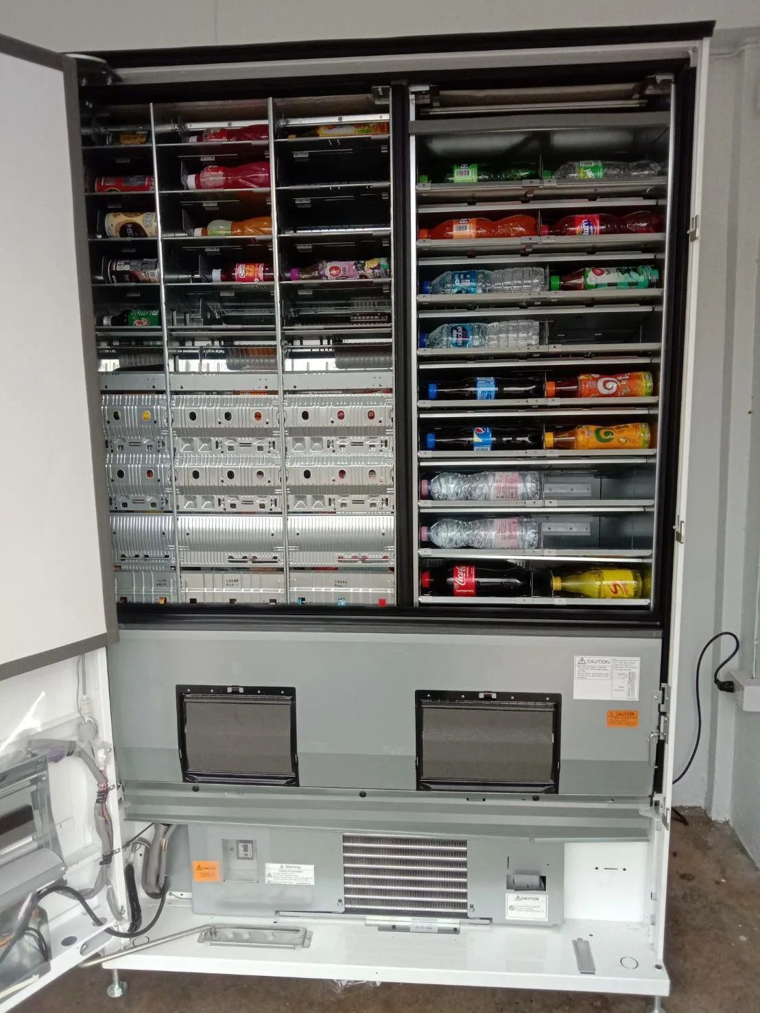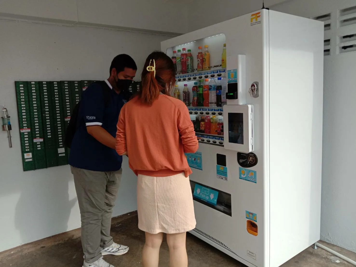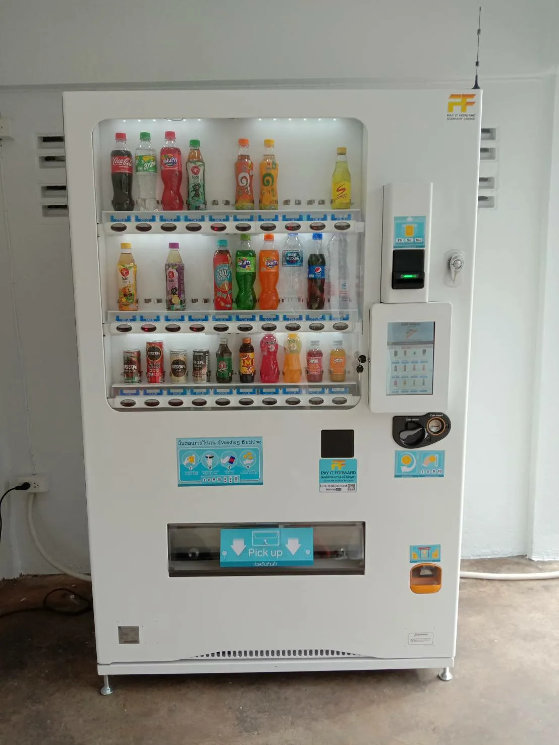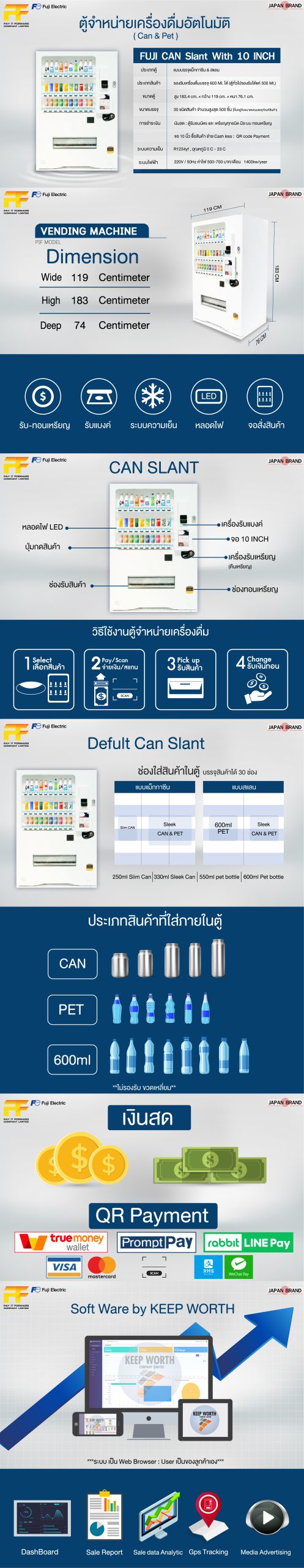 FUJI ตู้จำหน่ายสินค้าอัตโนมัติ CAN Slant จำหน่ายเครื่องดื่มแบบขวดพลาสติก PET กระป๋องและขวดแก้ว ใส่ขวดขนาด 600 ml.ได้ หน้าจอ 10 นิ้ว ชำระผ่านQR Code PrompPay LinePay True wallet ได้